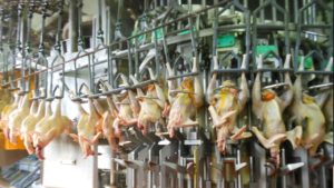 これは食用ニワトリの写真です。食用ニワトリはブロイラーといいます。ブロイラーはぎゅうぎゅうの囲いの中で育てられます。自由に羽も広げられず、時には他のブロイラーに羽を踏まれてけがをするものもいます。また、ブロイラーはひなの時に、ほかのブロイラーを突いてけがをさせないようくちばしを削られます。そして、お肉にするときには、このようにコンベアベルトに逆さにつるされて喉を切られます。そのまま失血死するまで放置されます。