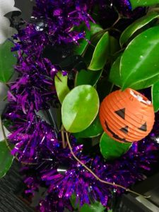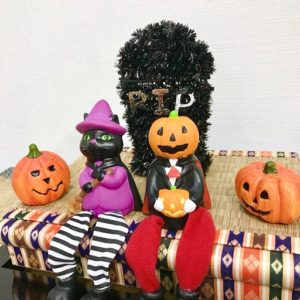 春にはおひな様が座るひな壇には、パンプキン君がお行儀よく座っています。