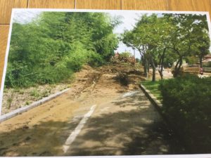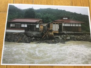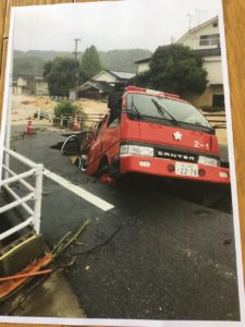 道路にはみ出ているお家は河内町。高齢者が亡くなりました。新聞配達の人が変な匂いがすると気がつき、直後山が崩れました。涙が出ます。
