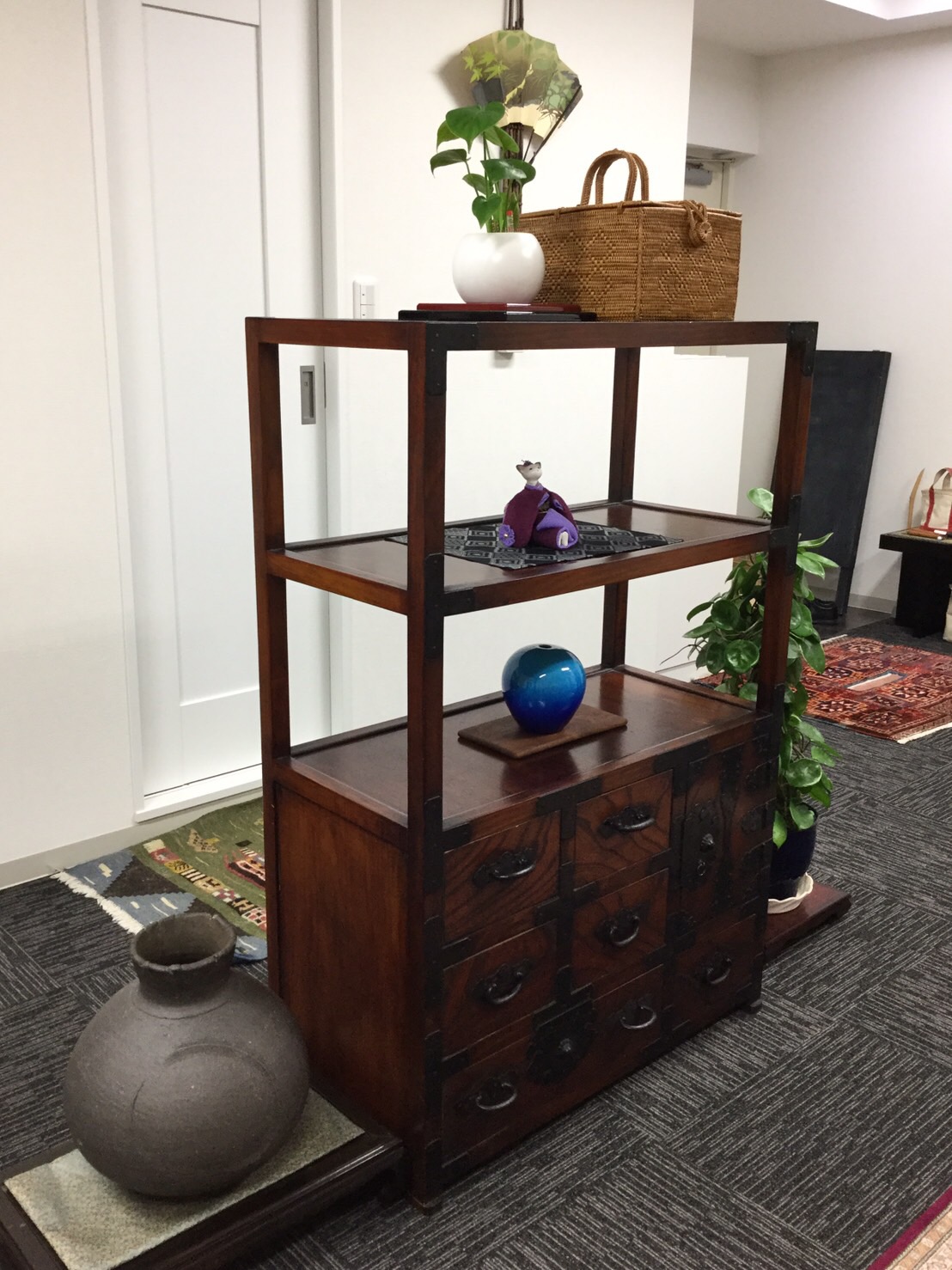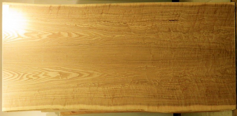 この大テーブルは、根元部分に「玉杢」と呼ばれる、大小さまざまな玉のような模様と、「縮み杢」と呼ばれるが広がり、末と呼ばれる空の方へ近くになるに連れて、すっきりとした表情へと変化していくドラマを持っています。